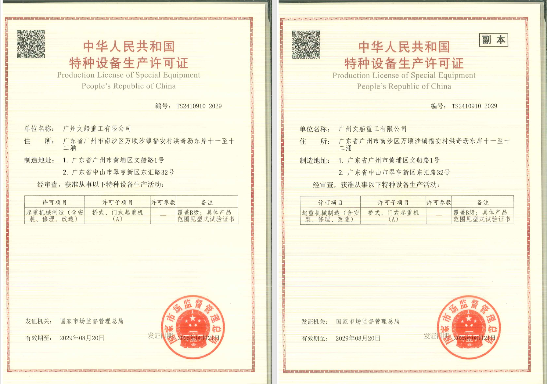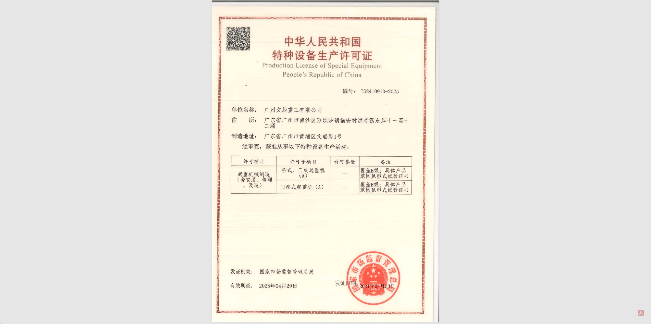 【Gantry Crane (Class A)】Production License of Special Equipment (People's Republic of China)